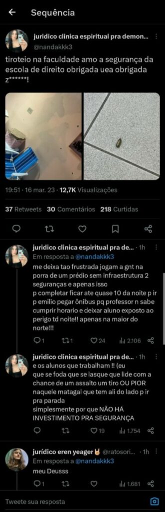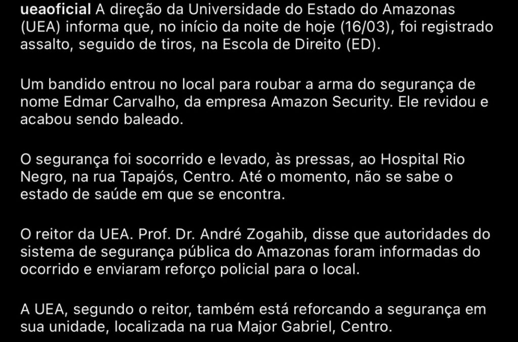 O reitor da UEA. Prof. Dr. André Zogahib, disse que autoridades do sistema de segurança pública do Amazonas foram informadas do ocorrido e enviaram reforço policial para o local.