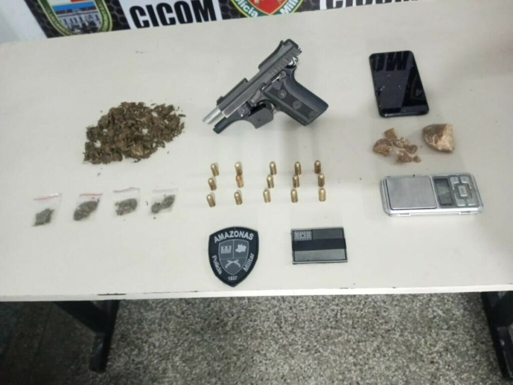 Manaus – Um homem, identificado como Henrique Rodrigo Tenório da Silva, de 22 anos, foi preso em flagrante nesta quinta-feira (11) na rua Quintino Bocaiúva, localizada no bairro Centro, zona Sul de Manaus. Segundo os policiais militares da 24º Companhia Interativa Comunitária (Cicom), uma denúncia anônima de moradores da área relatou um intenso movimento em uma vila conhecida por atuação de traficantes. A guarnição se deslocou para o local e na ocasião, flagraram o suspeito com posse de arma de fogo que até tentou fugir mas acabou sendo capturado. No quarto onde ele morava, foram apreendidas porções de maconha, balanças de precisão, pistola de 840 e munições de 9mm.