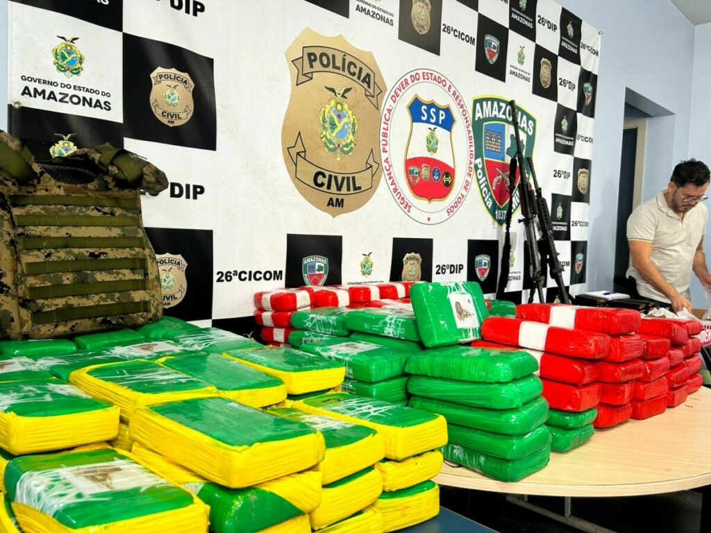 Amazonas – Na manhã desta quarta-feira (10), a Polícia Militar do Amazonas realizou uma apreensão milionária de drogas na cidade de Iranduba, localizada no interior do estado. Segundo informações do titular da 26ª Delegacia Interativa de Polícia (DIP), Ericsson Tavares, duas pessoas foram presas em flagrante e o material apreendido estava em embarcações no Lago do Paracanauba. Ao todo, foram encontrados 178 tabletes de cocaína, com valor estimado em 4 milhões de reais. Além disso, foram apreendidos um fuzil, uma granada, munições e um colete de cerâmica. Todo o material é proveniente da Colômbia, segundo as autoridades.