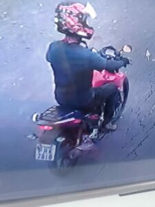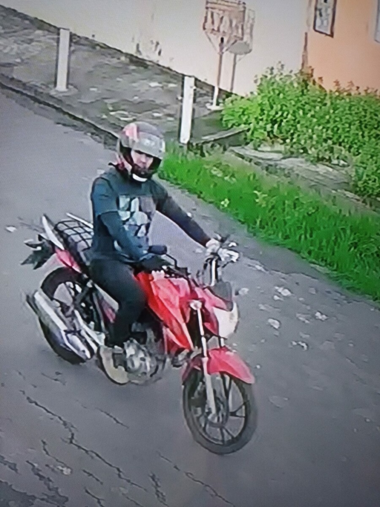 O suspeito está em uma motocicleta CG 160 vermelha, de placa PAK 7819. Em um dos momentos ele chega a olhar para uma das câmeras que registra o assalto. O criminoso rende os adolescentes por volta de 7h28, aponta uma arma para eles e subtrai os celulares. A ação dura pouco menos de 30 segundos.
