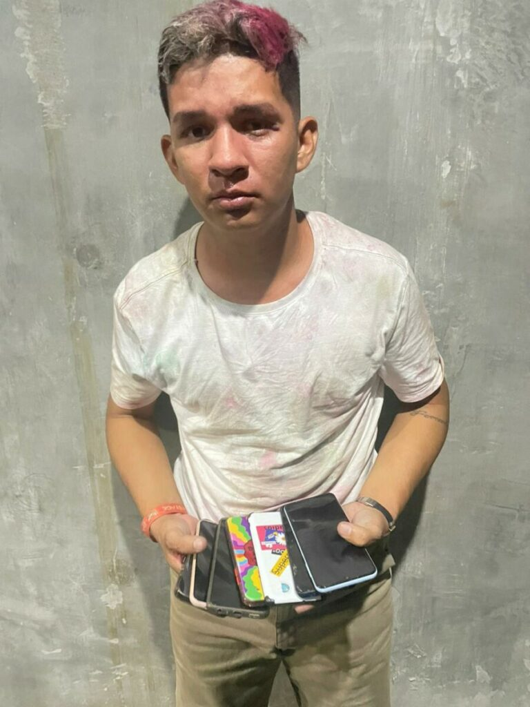A quadrilha, composta por três homens e quatro mulheres, foi presa em flagrante durante a festa ‘Pump Colors 2023’ no final deste domingo (4). Os suspeitos acabaram sendo pegos pelos seguranças do evento, que identificaram a ação criminosa e durante a revista encontraram vários aparelhos celulares com eles.