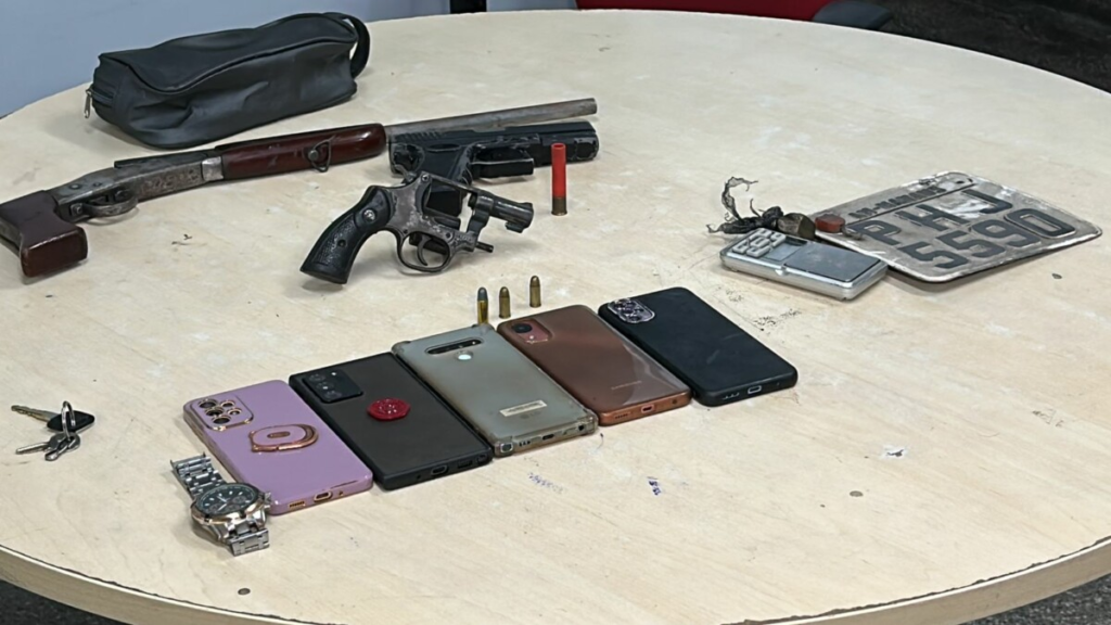 Na ocasião, o homem foi preso e o adolescente apreendido, e com eles foram encontrados duas armas de fogo, sendo um revólver calibre 32 e uma escopeta de cano serrado calibre 26; um simulacro de pistola; 5 celulares roubados, balança de precisão e porção de maconha. O caso foi registrado no 14º Distrito Integrado de Polícia (DIP).