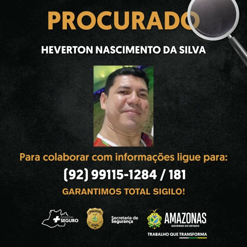 A Polícia Civil do Amazonas (PC-AM), por meio da Delegacia Especializada em Proteção à Criança e ao Adolescente (Depca), solicita ampla divulgação da imagem de Heverton Nascimento da Silva, 41, procurado por estupro de vulnerável contra uma criança de 11 anos. O crime ocorreu no dia 24 de janeiro de 2022, no bairro Nova Esperança, zona oeste.