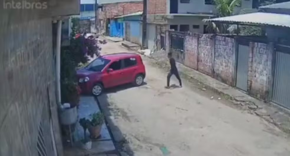 As imagens mostram a mulher descendo do veículo e caminhando em direção ao portão. Ao notar que o carro estava ligado e desocupado, o suspeito se aproxima, entra no automóvel e foge do local.